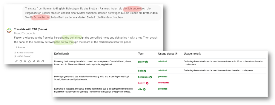 Beispiel für die Effektivität von TAG: die kleine Zusatzinformation aus der Usage Note der Termbank bewirkt, dass das LLM das Wort "Schraube" auf Englisch korrekt als "bolt" vs. "screw" wiedergeben kann. Ohne TAG ist diese Desambiguierung nicht möglich und bedingt humane Korrekturschleifen.
