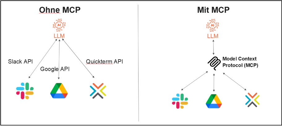 - Die Firmen-IT muss keine eigenen Clients programmieren. Mit anderen Ansätzen wie Function Calling oder Pipelines, muss de facto für jedes anzubindende Tool erneut ein Client entwickelt werden. Mit MCP ist einmal ein Standard geschaffen, auf den alle Use Cases und Applikationen zugreifen können.