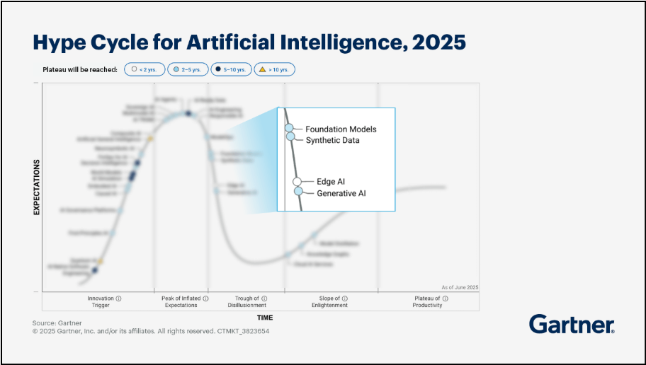 Der Hype Cycle von Gartner ist ein anschauliches Modell, das die Phasen der öffentlichen Aufmerksamkeit einer neuen Technologie bei deren Einführung beschreibt. 2025 überschritt GenAI und deren produktive Anwendung in Unternehmen den Gipfel der überzogenen Erwartungen im Hype Cycle von Gartner. Nach dem Hype folgt typischerweise der Abstieg in das "Tal der Enttäuschung". Genau an dieser Stelle befindet sich aktuell GenAI in der öffentlichen Wahrnehmung. Aber im Hintergrund beginnen sich die ersten produktiven Erfolge abzuzeichnen, und es beginnt teilweise bereits der Aufstieg zum "Plateau der Produktivität", den die generative KI laut Gartner in 2-5 Jahren erreichen wird.
