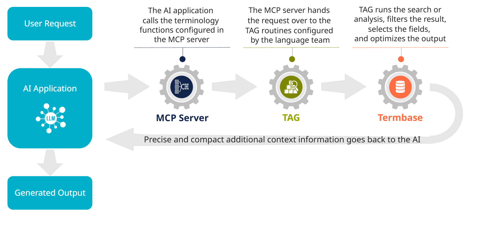 With our terminology-augmented generation (TAG) approach, we can provide LLMs with relevant context in a highly precise and compact form. This context provides additional information to the LLM in order to enrich the output on the basis of specific data – in our case, terminology data such as definitions and usage notes. And with TAG and MCP, we can even do this in real time. Both our own research and studies by independent experts (*) have shown how effective terminology can be in improving GenAI quality:Â